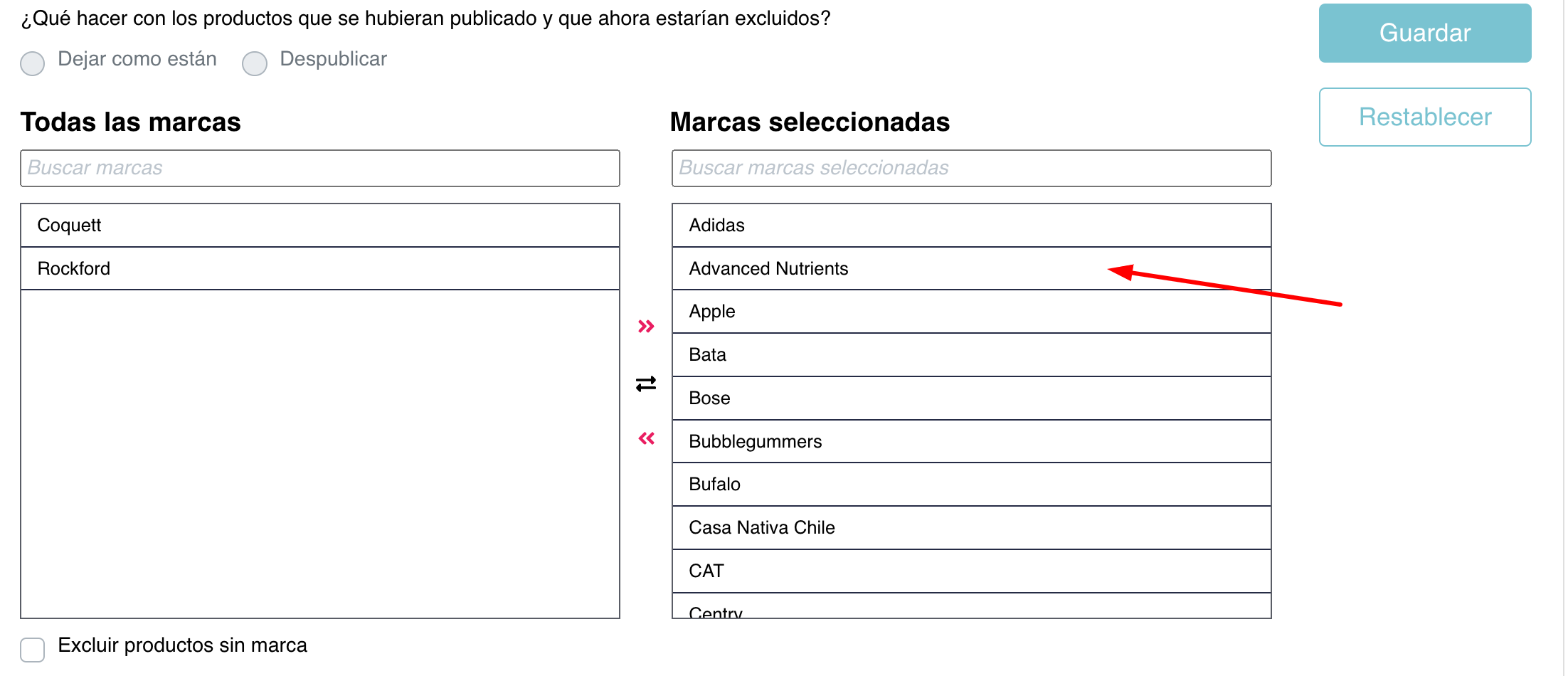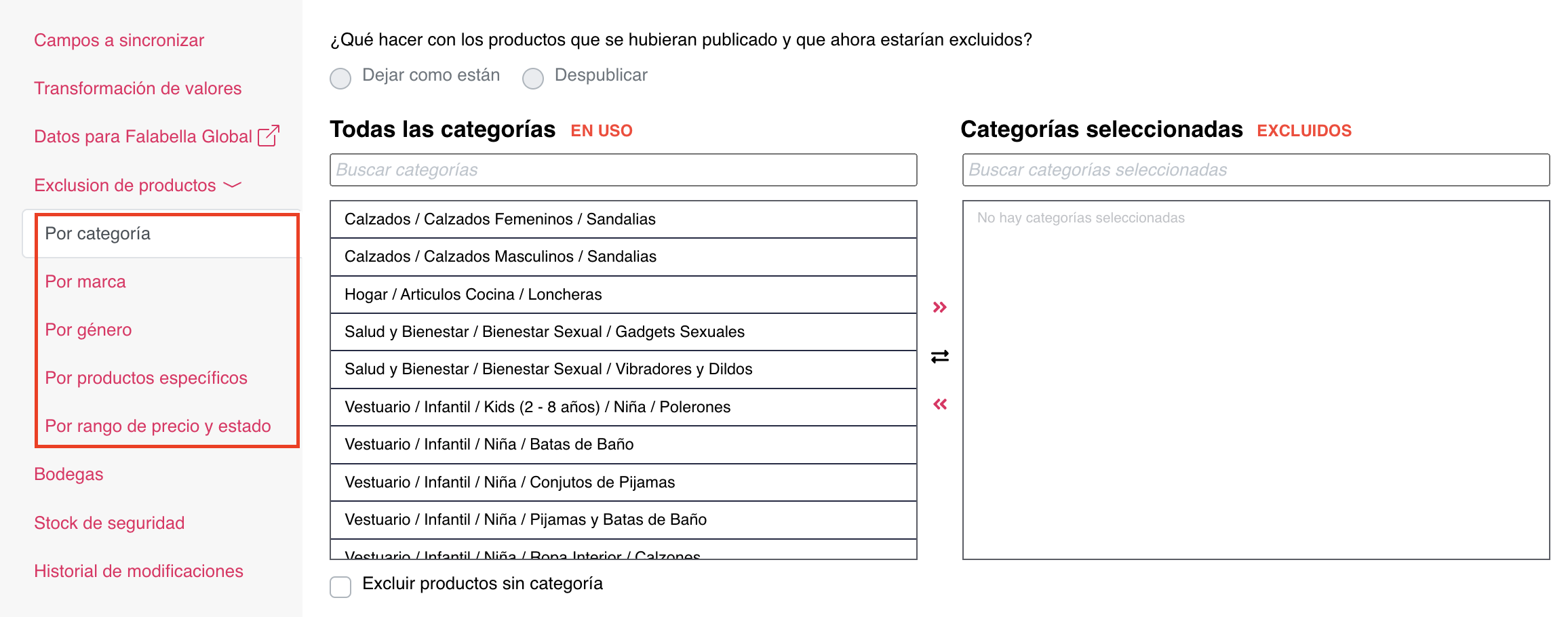 ** Recuerda que un producto excluido por marca, categoria no podrá ser "incluido" mediante carga masiva ya que existe esta regla general que impide que se "incluya" y sincronice, para eso primero modifica el criterio de exclusión.