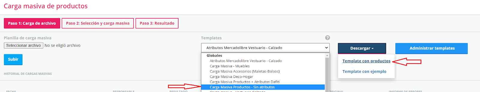 En descargar utilizar la opción "Template con Productos"